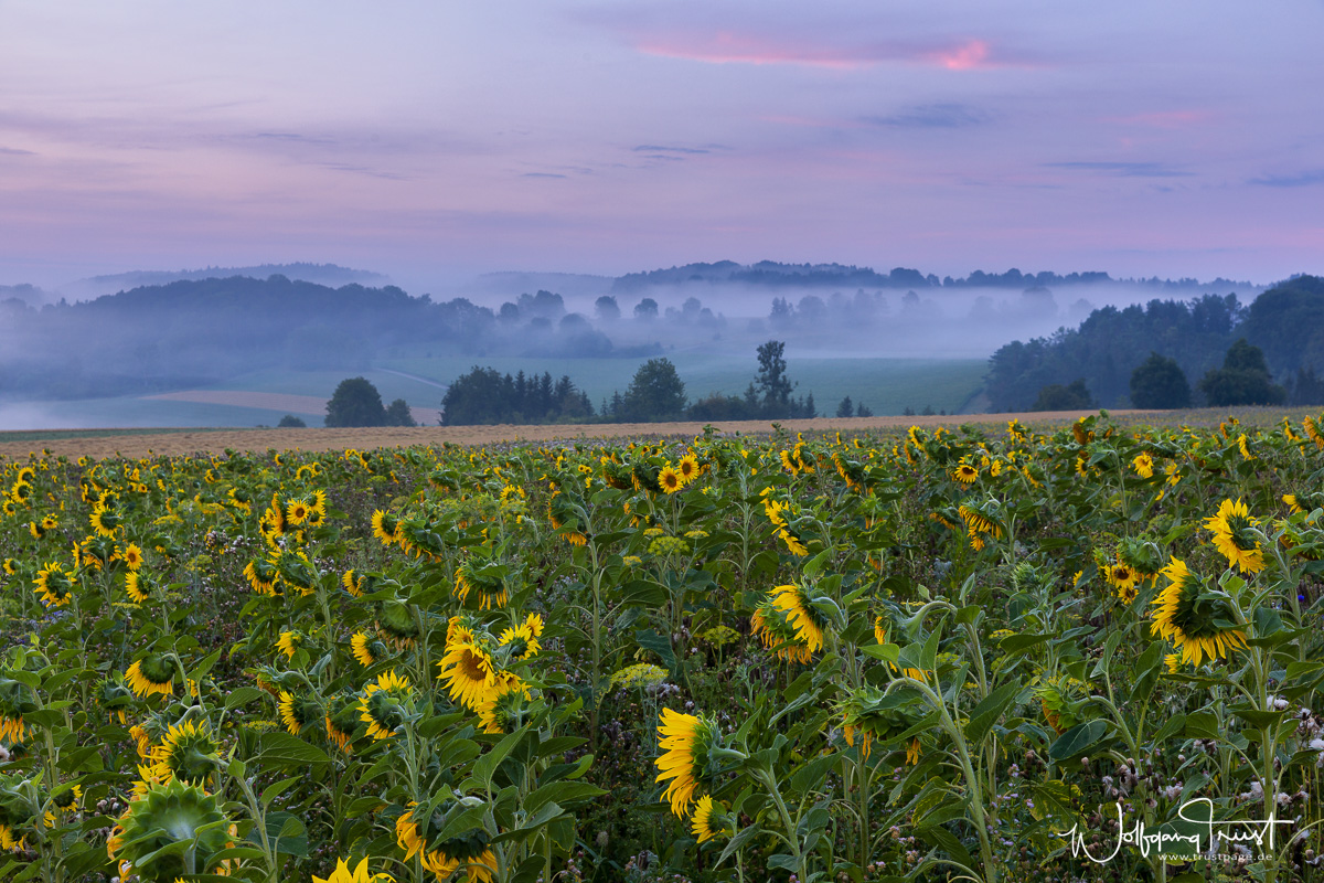 Blick über ein Sonnenblumenfeld am Morgen