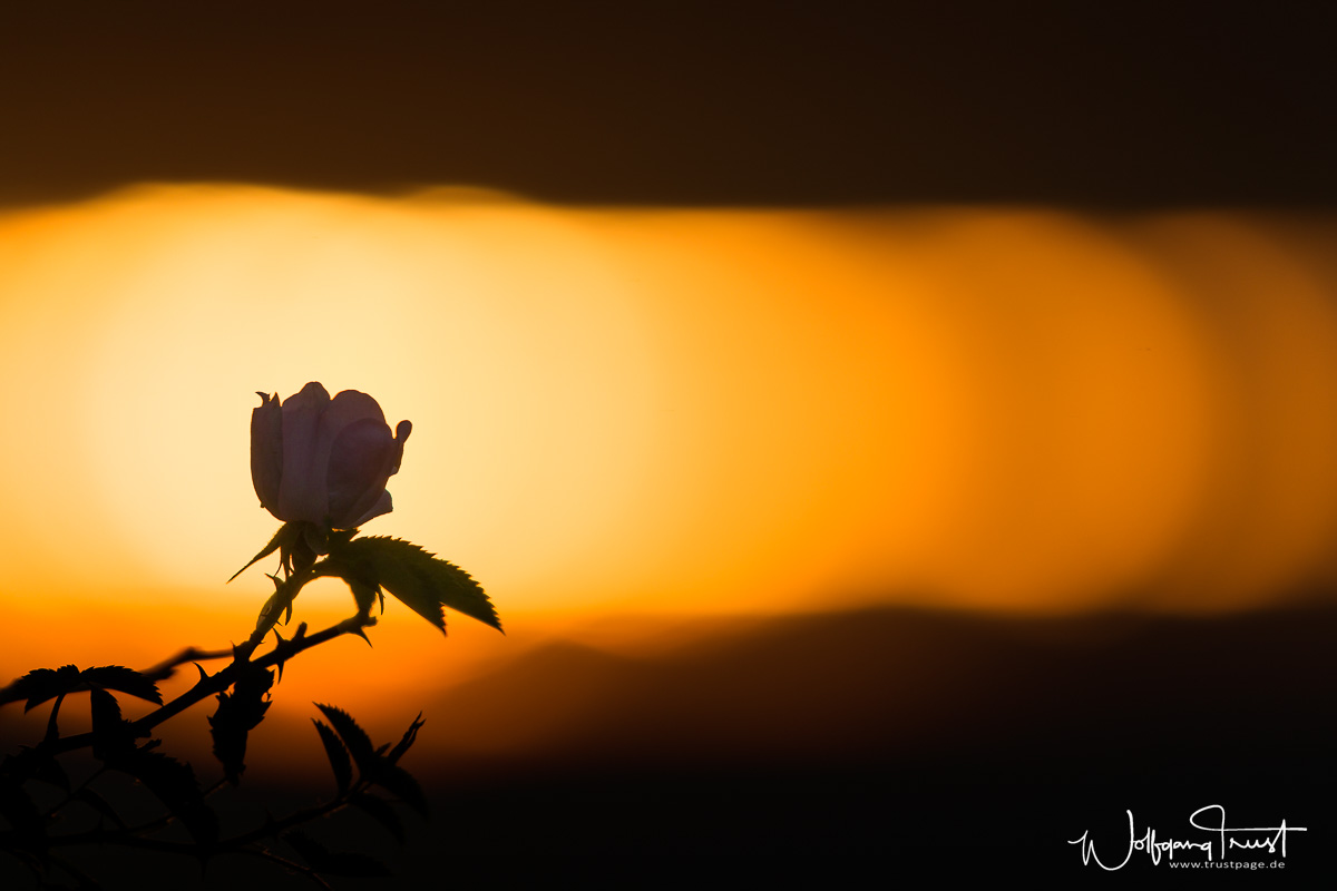 Wildrose vor einem schmalen Sonnenband am Albtrauf