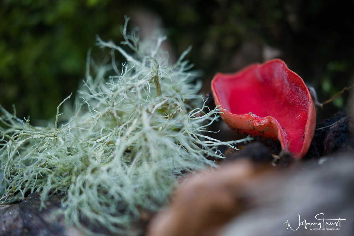 Zinnoberroter Kelchbecherling und Flechte