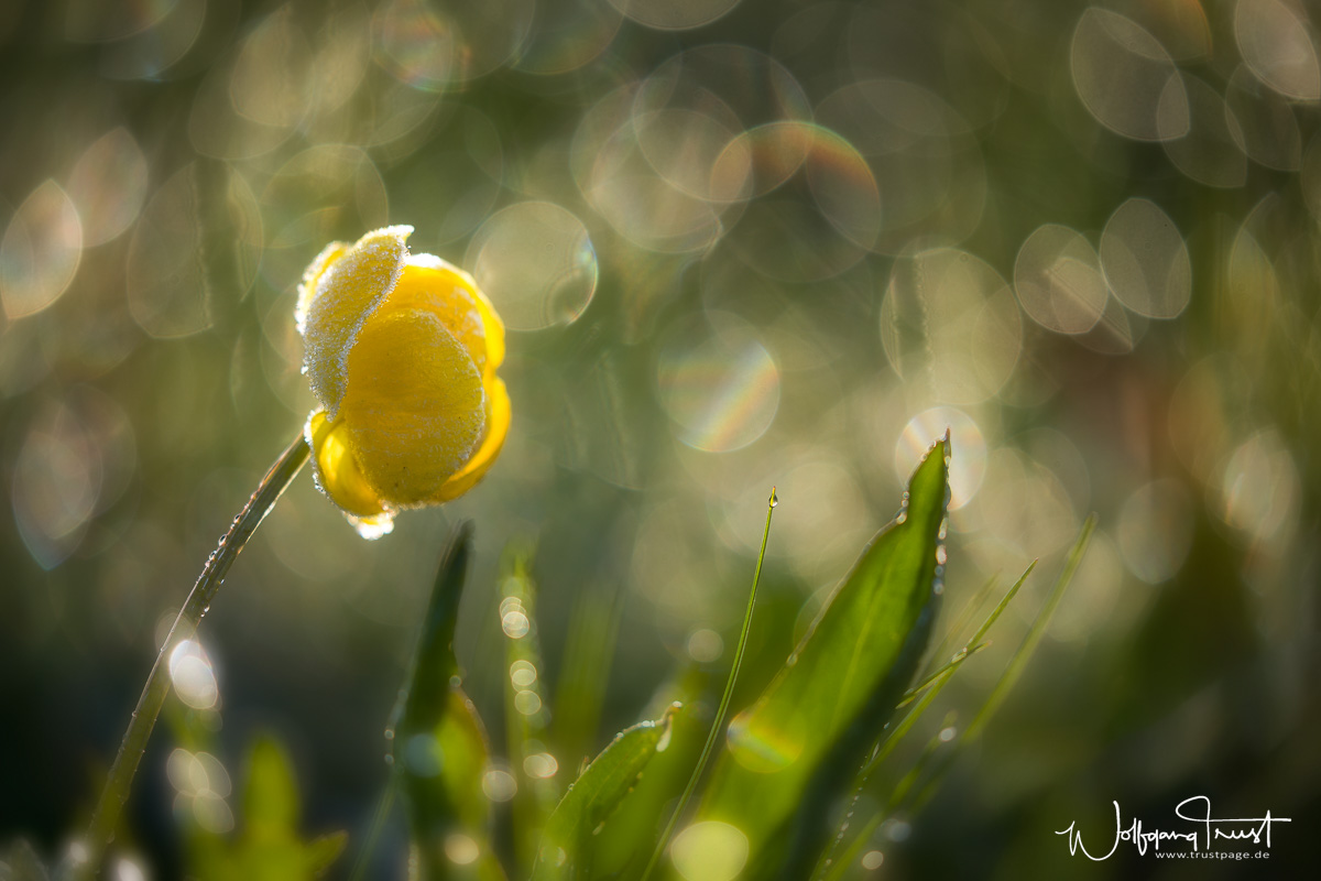 Trollblume neben kleinem Regentropfen