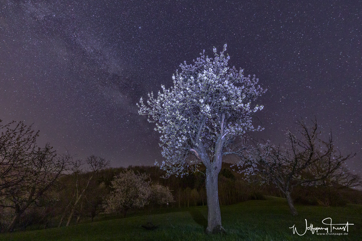 Milchstraße hinter blühendem Obstbaum